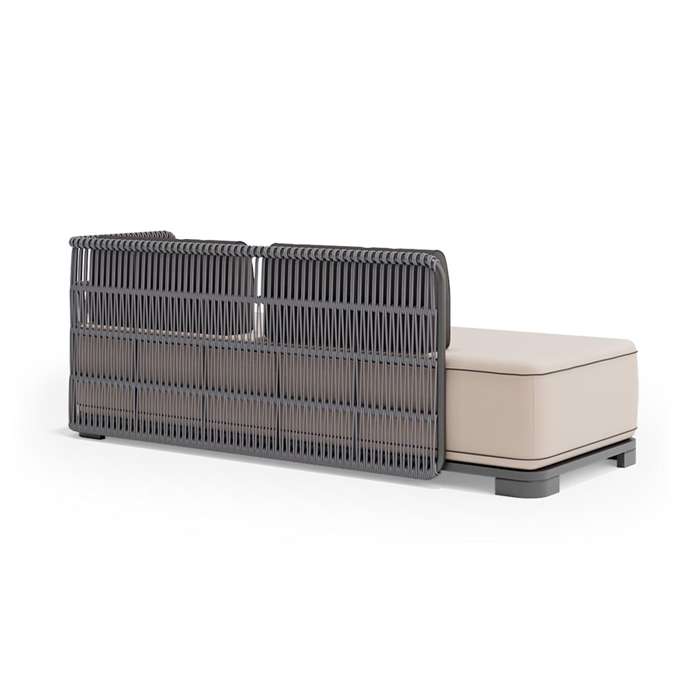 Каркас из алюминия защищен от коррозии и погодных условий, а плетение из шнура AuricaRope диаметром 6 мм добавляет фактурности и дополняет теплом ручной работы. Обивка из акриловой водоотталкивающей ткани сохраняет свои свойства даже при длительном использовании на улице.
