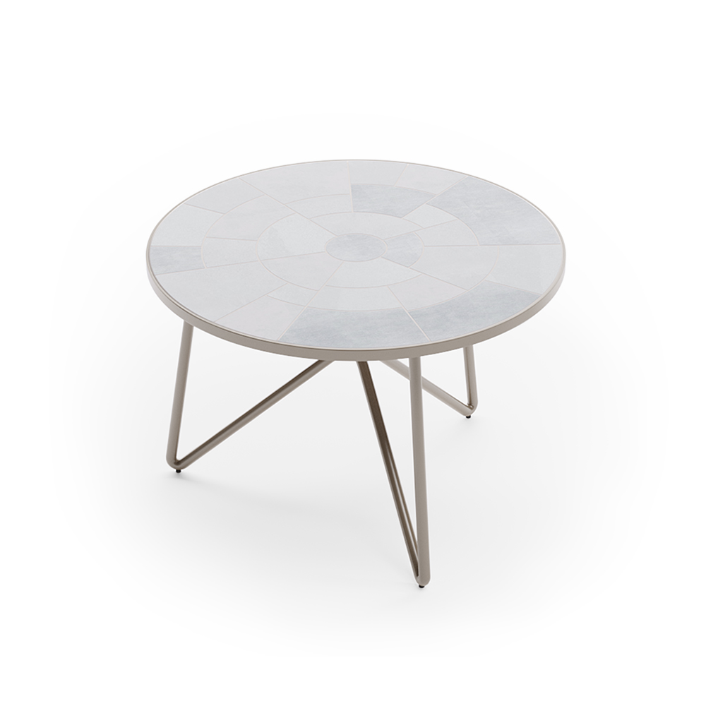 Для создания стола используется каркас из алюминиевого сплава и столешница в виде геометрического орнамента из керамогранита.