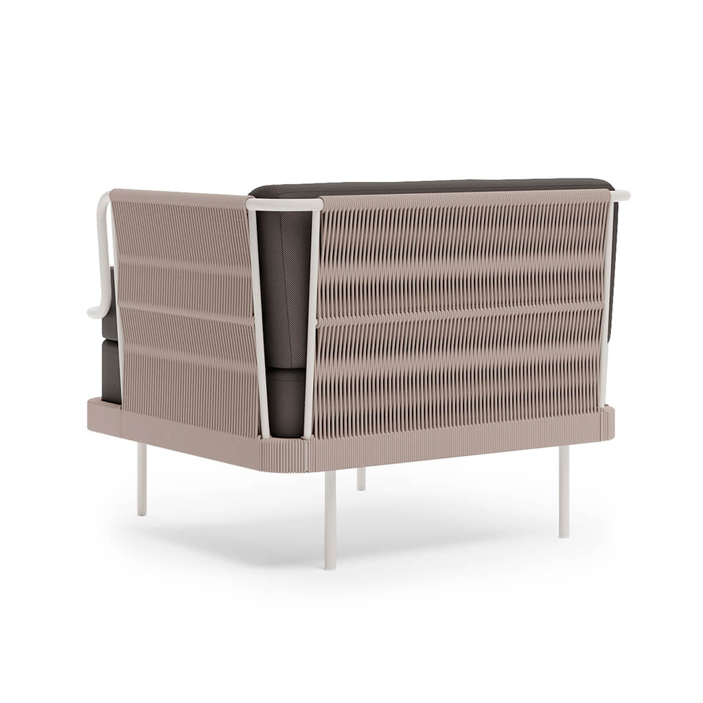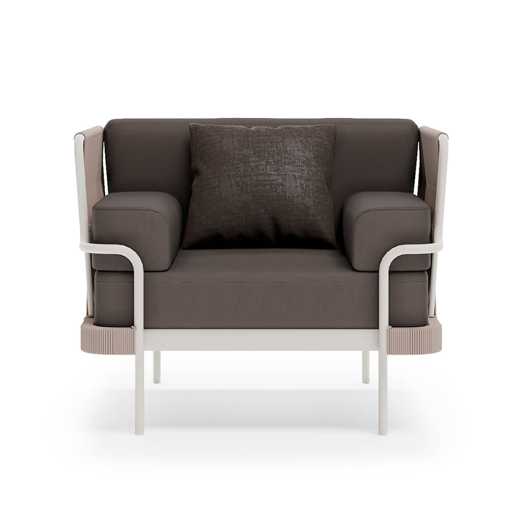 Кресло сделано из алюминиевого каркаса, плетения AuricaRope и прочной водоотталкивающей ткани.